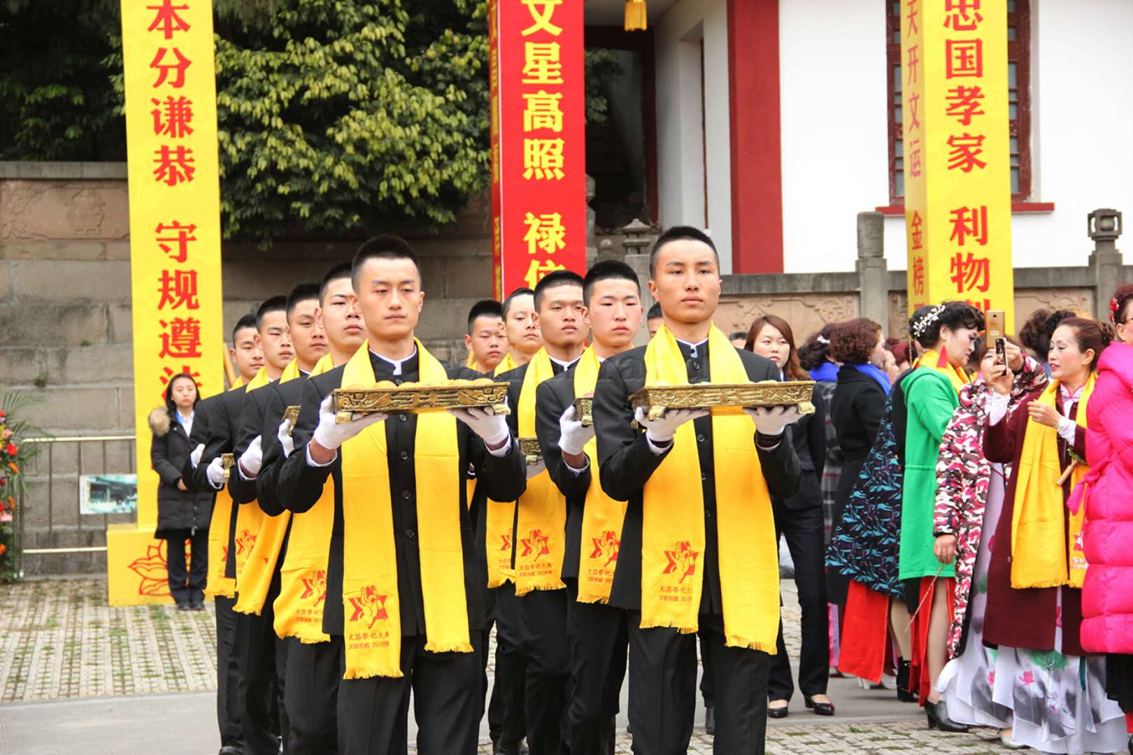 伴著歌舞,初獻禮開始。30名高校學子代表沿祭祀通道緩緩上前,向文昌帝君恭獻書卷,而后齊聲朗誦被譽為“善書三圣經”之一的《文昌陰騭文》名句,“濟人之難,救人之急,憫人之孤,容人之過,廣行陰騭,上格蒼穹……”莘莘學子的誦讀,形象的傳播出文昌文化所倡導的扶危濟困、助人為樂的道德思想。